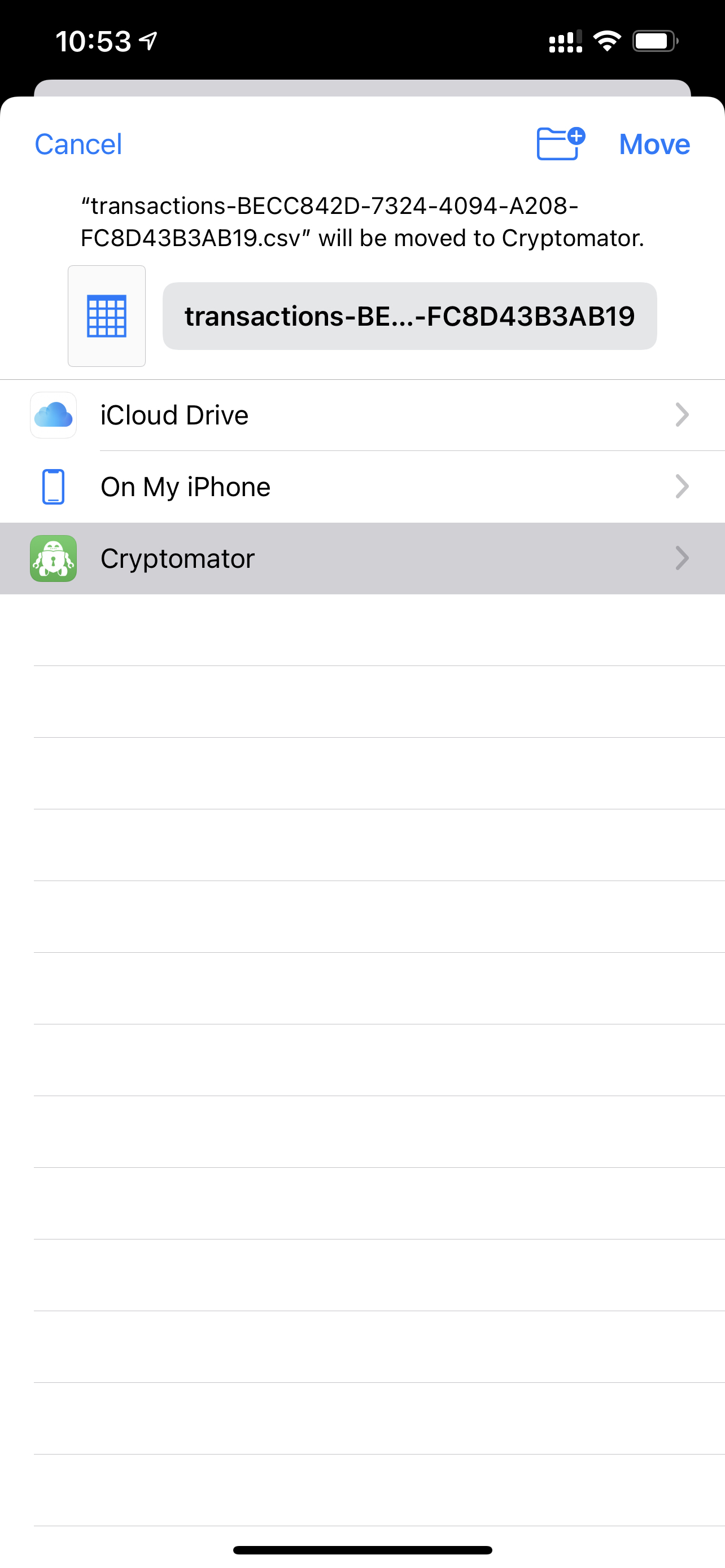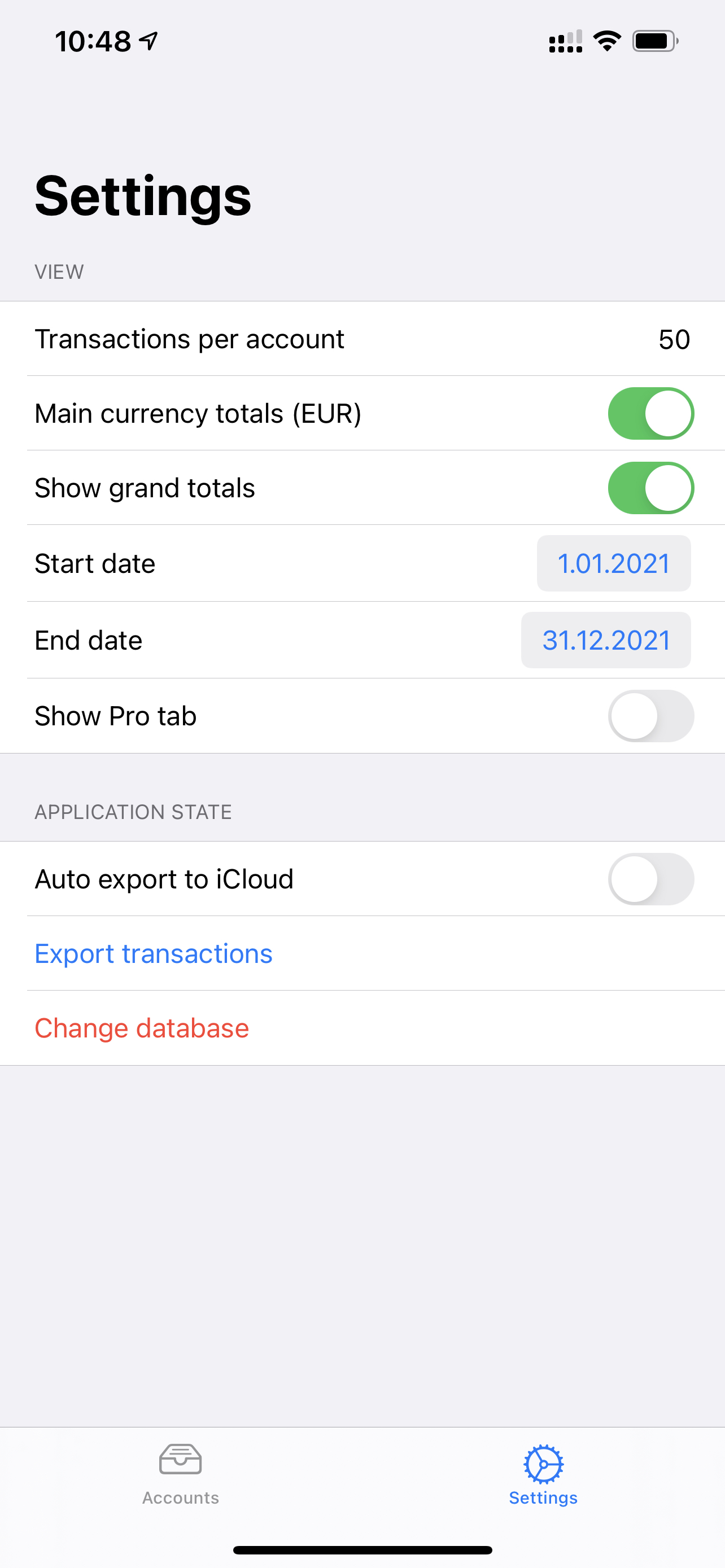 The next step is to export transactions from the app at the end of the day. Two ways available: Automatic and Manual modes. In the automatic mode application exports transactions when the app goes to the background. The drawback of this method is that it is possible to export the state of the app to iCloud only. I don’t want to store unencrypted transactions to iCloud. My way is to export the state to the specified location (cryptomator vault in my case) manually. This option is available in the settings.